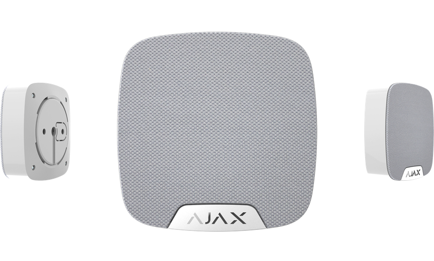 Ajax HomeSiren. Tipo: Sirena wireless, Posizionamento disponibile: Interno, Frequenza di funzionamento: 868 - 868.6 MHz. Tipo batteria: CR123A, Voltaggio della batteria: 3 V, Durata batteria: 5 anno/i. Peso: 97 g. Numero di batterie incluse: 2 pz. Dimensioni (LxPxA): 75 x 27 x 76 mm