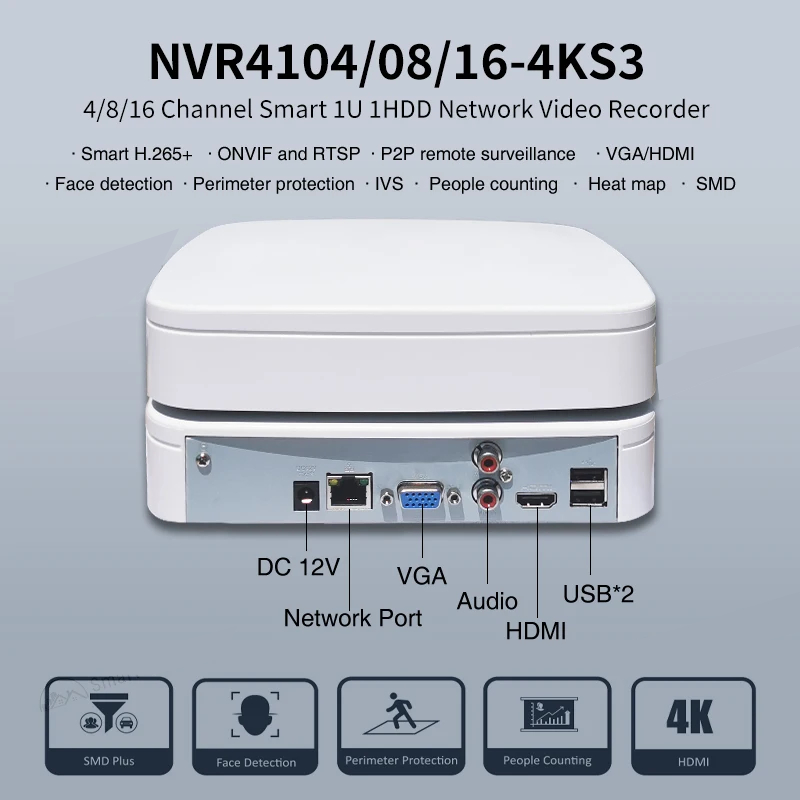Dahua NVR4116-4KS3 NVR IP 16 canali 12 Megapixel, Intelligenza artificiale nel registratore: SMD Plus su 4 canali, 1 ingresso/1 uscita audio RCA, Smart H.265+
