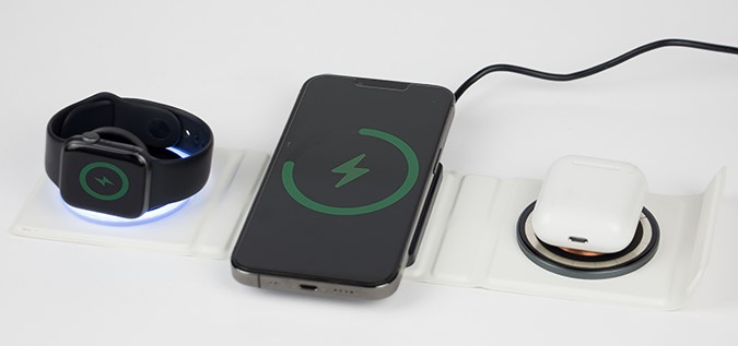 Tappetino di ricarica rapida wireless 3 in 1. Dudùu X-Folding è un tappertino di ricarica wireless dotato di aggancio magnetico che ha la funzione di ricaricare tre device contemporaneamente come auricolari, smartphone e Apple Watch (IOS). Con luce led incorporata. Elimina tutte le prese e i fili in eccesso, scopri la comodità di un prodotto tascabile.